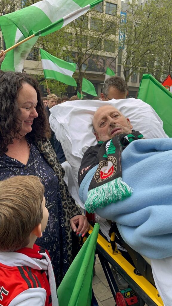 Maandagmorgen zijn we vertrokken met de Wish&Care-ambulance richting Rotterdam voor de huldiging van Feyenoord. Als fanatieke Feyenoord-supporter heeft mijn man altijd gezegd: “Ik wil ooit met ons kind naar een huldiging van Feyenoord gaan als ze weer eens kampioen worden.” Dat het nu zo snel moest gebeuren, hadden we allemaal niet verwacht. Mijn man was een redelijk fitte en mobiele man die nog hoopvolle therapie zou ondergaan, maar drie weken geleden veranderde hij plotseling in een volledig afhankelijke patiënt die bedlegerig is. Onze jongste, van 7 jaar oud, zat naast de chauffeur en ikzelf zat achterin bij mijn man en de verpleegkundige. Na een comfortabele en vlotte rit waren we binnen de kortste keren op de Coolsingel. Ik wil ook graag de gemeente Rotterdam complimenteren voor het soepele verloop van de aankomst. En wat een dag was het! Geweldig! We hadden een geweldige plek vooraan en de vrijwilligers waren ontzettend lief. Zowel Jan als Nicole zorgden niet alleen voor mijn man, maar zorgden er ook voor dat onze jongste zoon de dag van zijn leven had. En dat resulteerde weer in liefdevolle blikken van mijn man naar onze zoon. Dat was onbetaalbaar. Ik kan niet in woorden uitdrukken wat deze dag voor ons heeft betekend, het was gewoonweg onbetaalbaar. Mijn dank gaat dan ook uit naar iedereen die hierbij betrokken was, die dit geregeld heeft en die dit mogelijk heeft gemaakt.